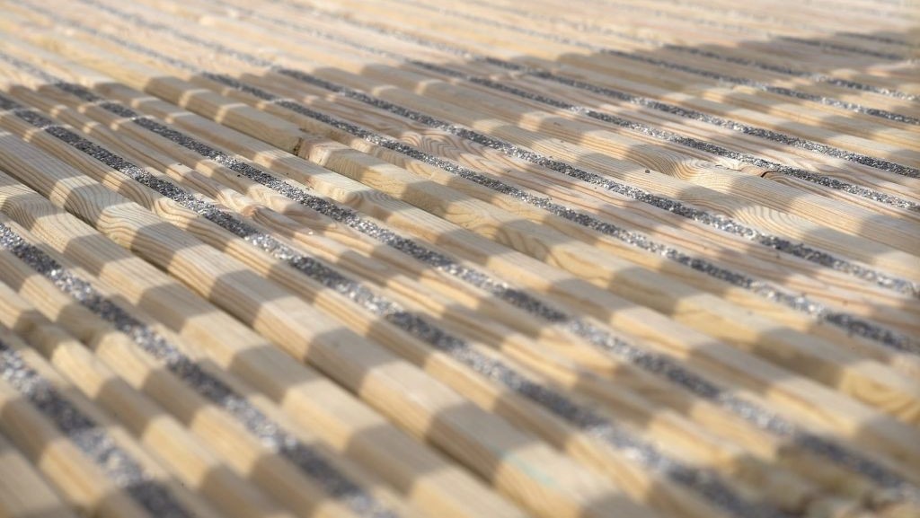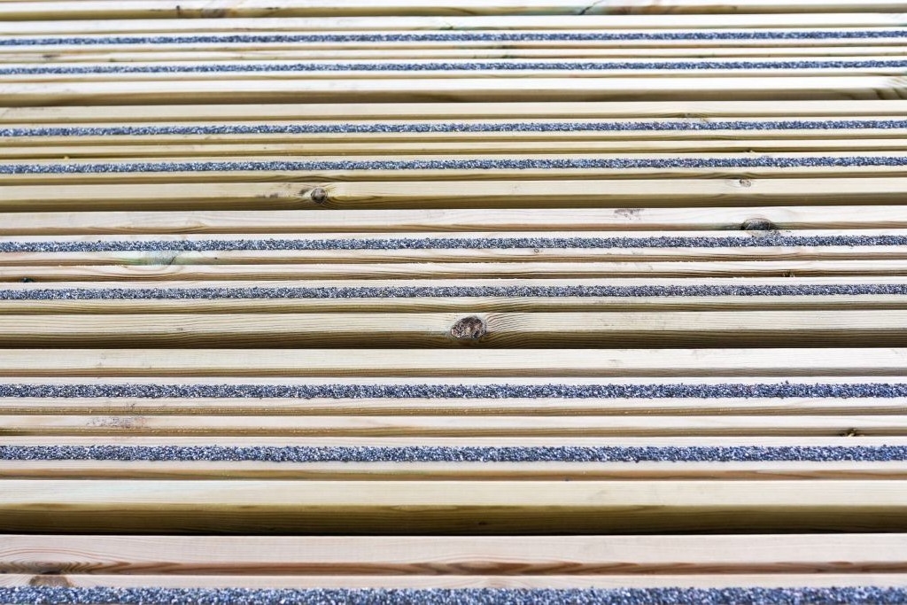 Combining natural timber decking with two hardened aggregate non-slip infills, a stylish looking deck can be achieved that delivers peace of mind throughout the year.